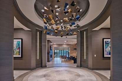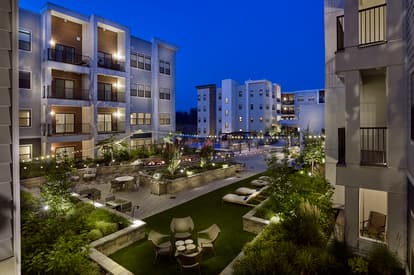 The community clubhouse includes resident lounges, a fitness center, a business center, a billiards room, a 24-hour package concierge area, a pet spa, and bicycle storage. The extensive courtyard boasts a putting green, resort-style pool, outdoor yoga space, an outdoor kitchen with TVs and seating, outdoor grilling areas, and an outdoor fire lounge.