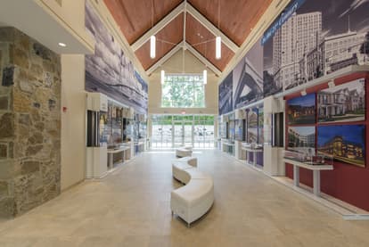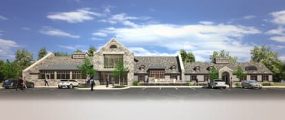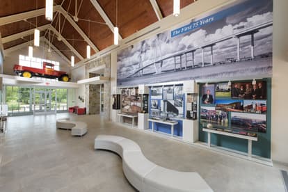 The building also houses high-tech conference rooms, a large training room, and offices. Behind the building, a new courtyard features a two-tier decorative water fountain, a large fireplace, a built-in grill, bluestone pavers, brick pavers, and Timberframe trellises and gates.